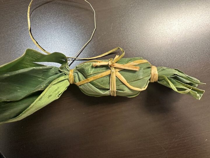 Sasadango is wrapped in fragrant bamboo leaves (sasa), which help preserve its freshness and add a subtle aroma to the mochi. Before eating, gently untie the string (or straw) and peel back the leaves. The leaves are not edible, so be sure to remove them completely.